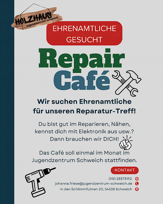 Wir starten ein neues Projekt im Jugendzentrum Schweich und suchen Ehrenamtliche, die uns dabei unterstützen wollen! Einmal im Monat möchten wir einen Reparatur-Treff (Repair Café) organisieren.