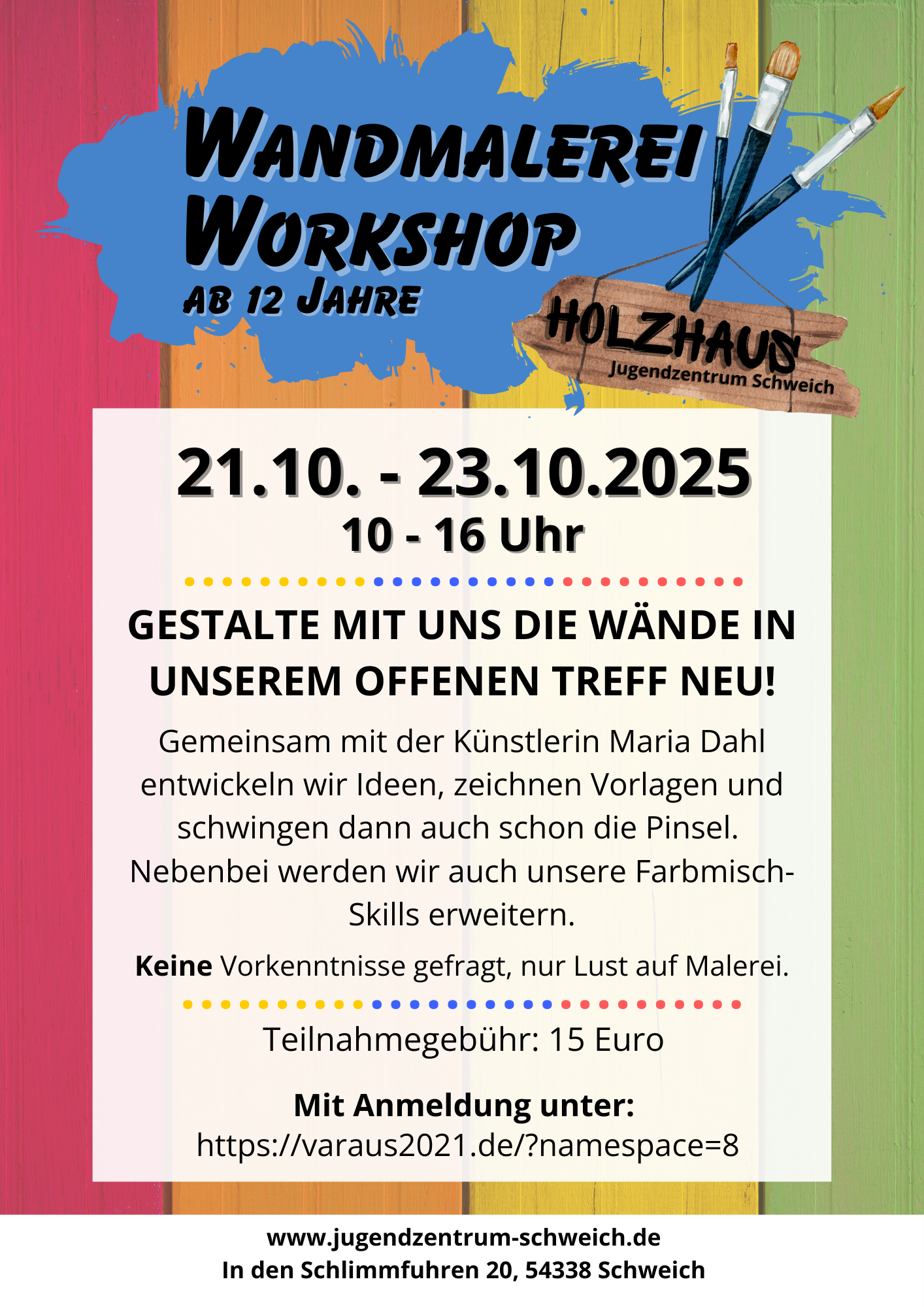 Der Wandmalerei Workshop wurde leider abgesagt, aber gute Neuigkeiten: Wir werden ihn nachholen! Also stay tuned!!